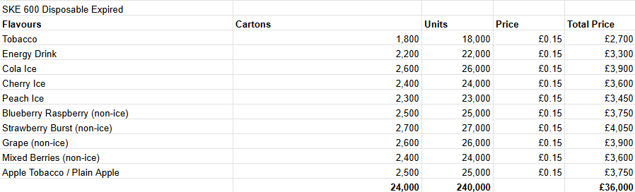 DISPOSABLE VAPES - EXPIRED(Within 9 months) Batch 2Brand - SKEFlavours - 10Type - 600 PuffsCartons - 24,000Quantity - 240,000 vapesPrice - 15pLocation - North UK 🇬🇧 Usual T&Cs apply. Deposit, Inspection, Pay Balance and you arrange Collection.All goods sold "X works" and deposit is NON refundable - Only refundable if goods are not as described above