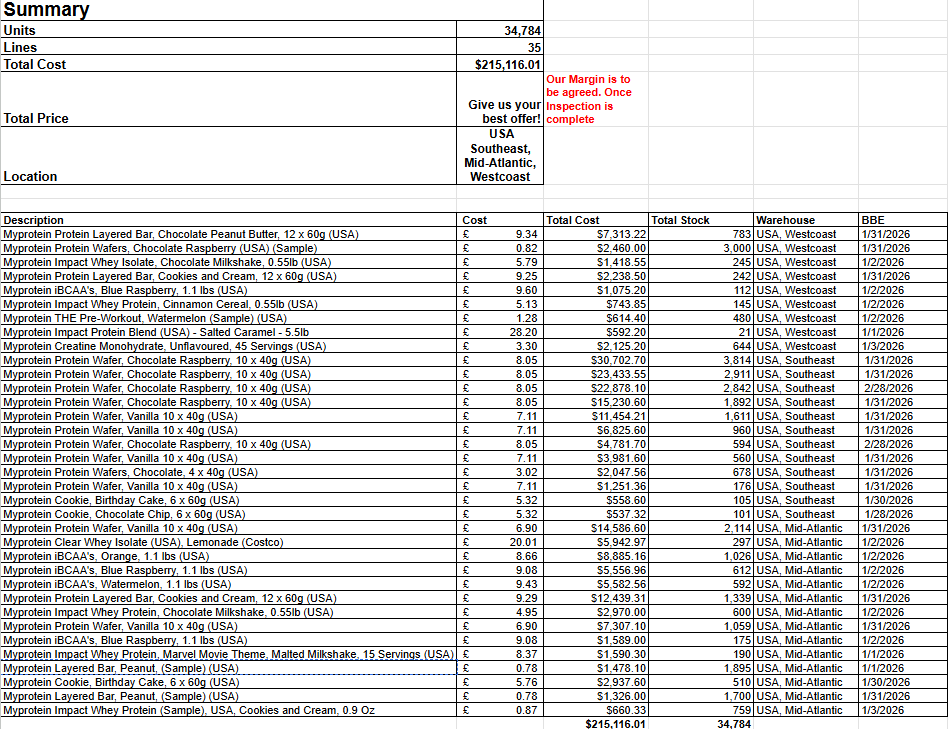 JOBLOT DEAL - US Protein Cookies, Wafers, Bars, Flavoured Pre-Workout, Creatine, Cereal Expiry - Just Expired Lines - 35 Total Units - 34,784 Total Cost - $215,116.01 Price - Best Offer Location - USA Southeast, Mid-Atlantic & West Coast Our Margin is to be agreed. Once Inspection is complete Usual T&Cs apply. Deposit, Inspection, Pay Balance and you arrange Collection. All goods sold "X works" and deposit is NON refundable - Only refundable if goods are not as described above
