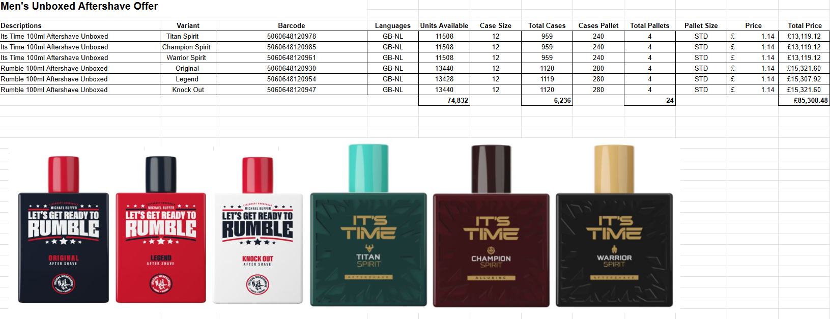 Liquidation Stock - Men's Unboxed AftershaveTypes - 6Size - 100mlBarcodes - Available on BreakdownUnits - 74,832Total Cases - 6,236Pallets - 24Price per unit - £1.14Total Price - £85,304.48Pick out ANY FULL LINE.Breakdown available upon request and on our website!Usual T&Cs apply. Deposit, Inspection, Pay Balance and you arrange Collection.All goods sold "X works" and deposit is NON refundable - Only refundable if goods are not as described above