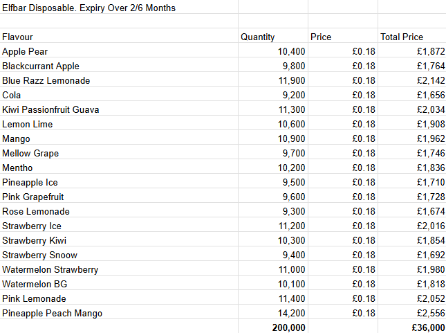 DISPOSABLE VAPES - IN DATE Expiry - Over 2 / 6 months Flavours - 19 Brand - Elf Bar Type - 600 Puffs Quantity - 200,000 vapes Price - 18p Location - North UK 🇬🇧 Usual T&Cs apply. Deposit, Inspection, Pay Balance and you arrange Collection. All goods sold "X works" and deposit is NON refundable - Only refundable if goods are not as described above